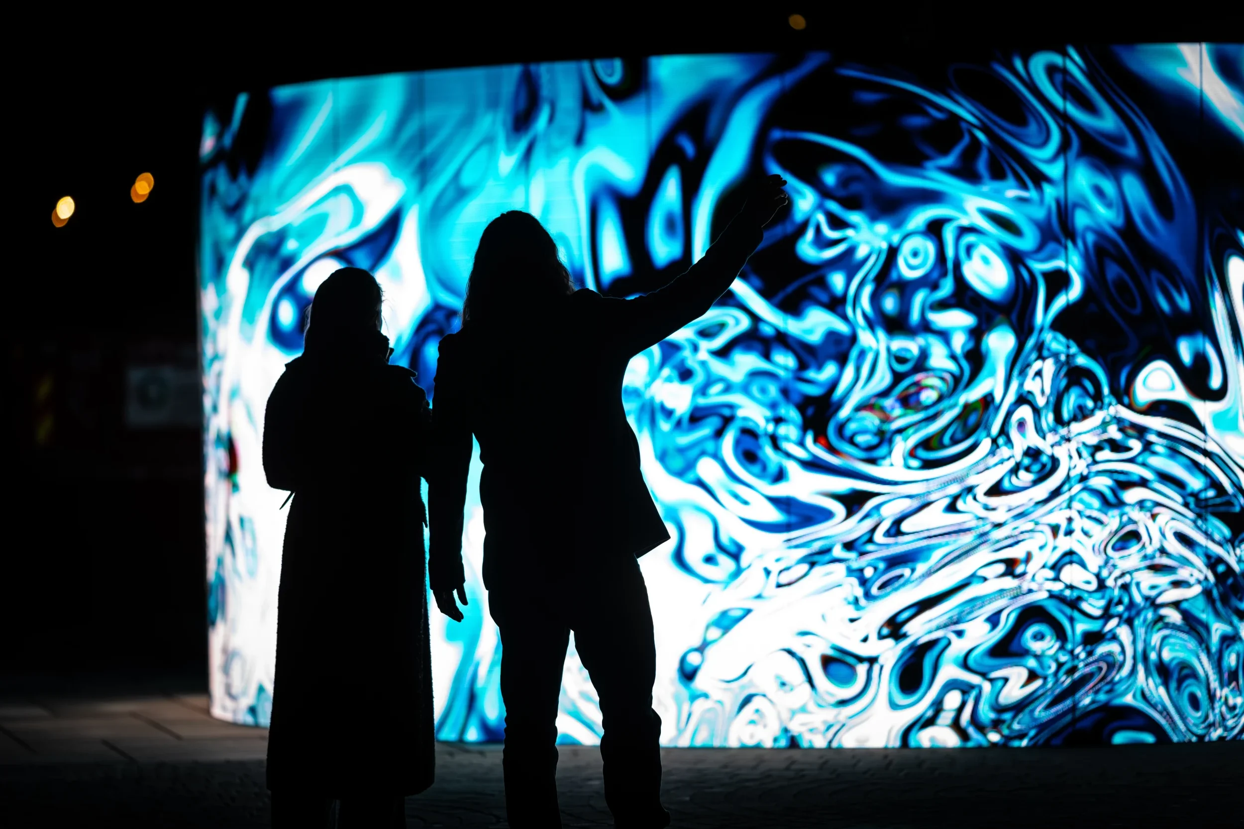 POINT OF (NO) RETURN er en stemningsfull, interaktiv installasjon som gjør publikum til medskapere av en visuelt gripende opplevelse. Trår man inn i lyset, smelter lysende is til rennende vann – og fryser til igjen når man trår ut.